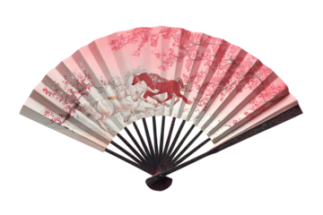 Elegant folding fan with cherry blossoms and mountain on transparent background