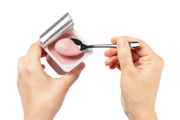 Set of Pink frozen yogurt in a pink cup with a spoon held by a hand isolated on white background. Concept of sweet dessert and refreshment