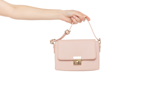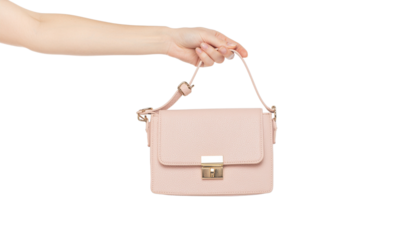 Pink leather tote bag with gold buckles and handles on black background handbag