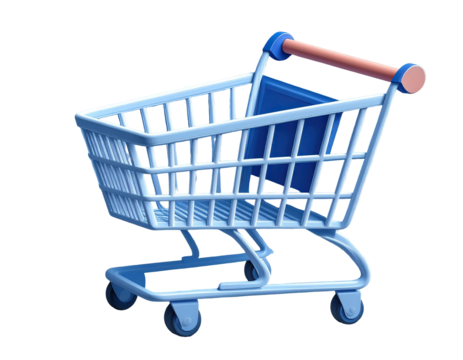 Light-blue shopping cart, angled view,  empty,  with pink handles