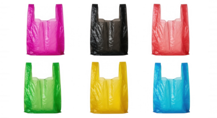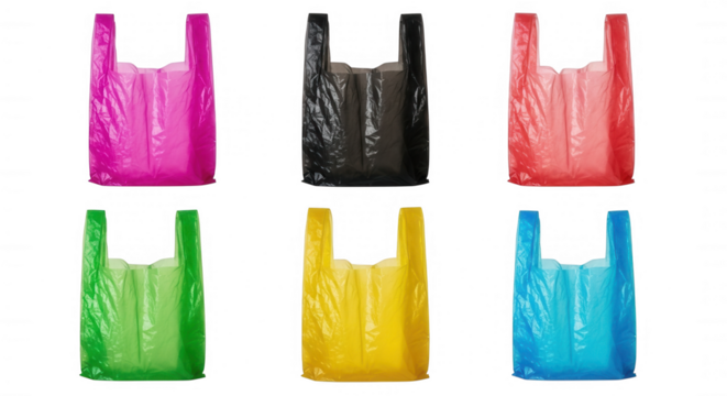 Colorful plastic bags arranged in two rows isolated on a transparent background shopping pink