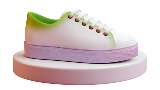 One sneaker stepping over a mini white platform, side and toe view, isolated,
