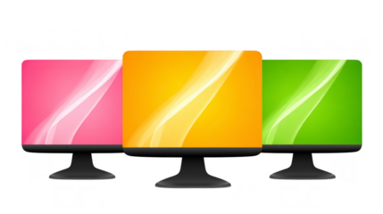 Colorful computer monitor set with pink, yellow, and green screens, modern flat design, isolated on transparency background, technology concept, vibrant and cheerful style