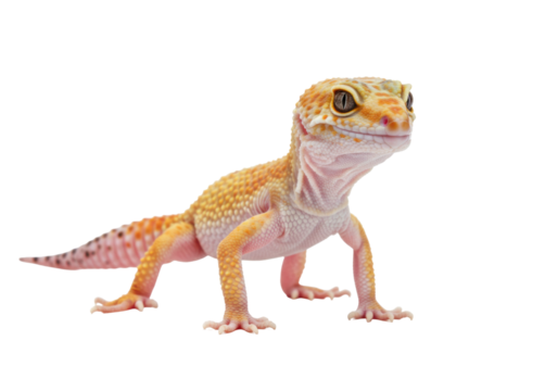 A studio photograph of an isolated leopard gecko with a unique pattern, spots, and a tail on a transparent background. Reptile and pet.