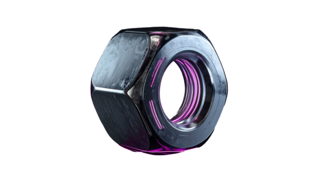 Close-up of a metallic hexagonal nut with glowing inner threads