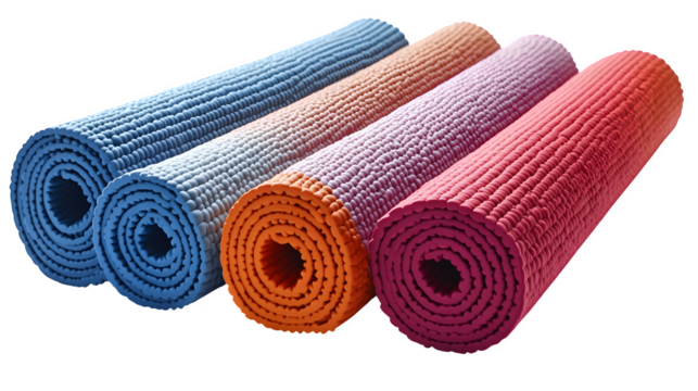 Colorful rolled yoga mats isolated on transparent background for fitness and exercise