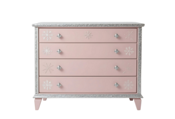 Wintery matte pale pink chest of drawers with silver frosted trim and snowflake etching, holiday-ready styling on white background.