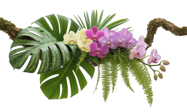 Watercolor illustration of tropical flowers and leaves isolated on transparent background