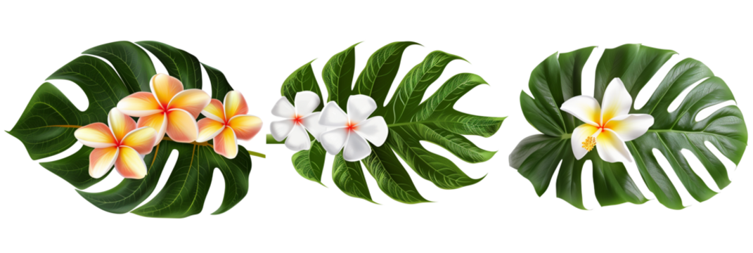 set of groupings of plumeria with monstera leaves, isolated on transparent background
