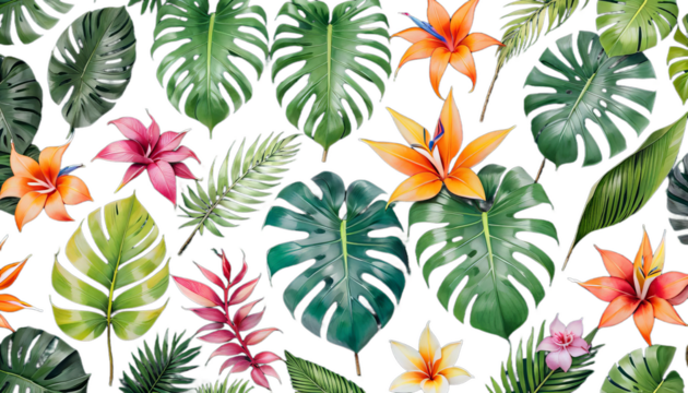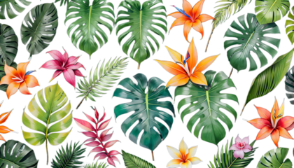 strelitzia flowers anthurium jungle branches bright palm watercolor monstera leaves leaf orchid tropical grass liconia set floral foliage isolated banana wedding exotic vintage greenery graphic