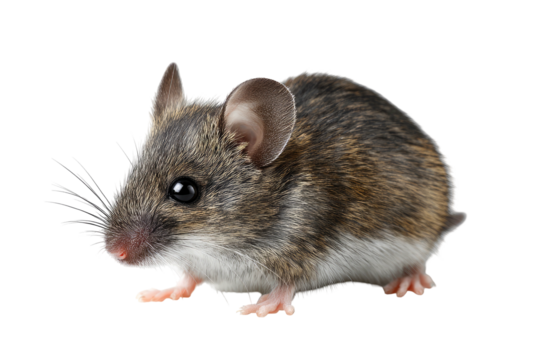 Small, brownish-grey mouse with pointy ears and long whiskers