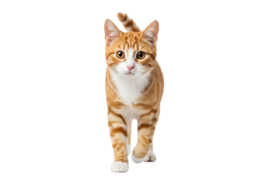 Young orange and white tabby cat with golden eyes and pink nose walking towards viewer, one paw lifted, curious and alert, on plain white background with copy space, professional studio pet