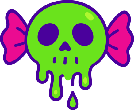 A neon green dripping skull candy with bright pink wrapper ends is illustrated in a bold spooky-cute style with thick purple outlines.