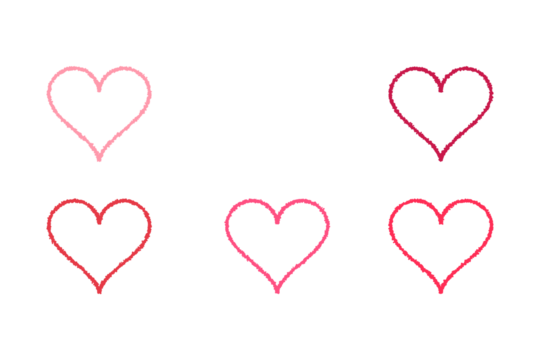 A collection of hand-drawn heart outlines in various shades of red, pink, and white on a stark black background isolated on transparent background