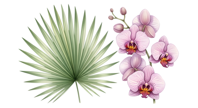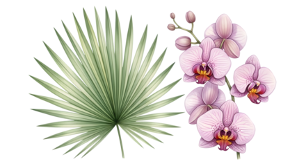 Tropical palm leaf and orchid isolated on transparent background, botanical illustration