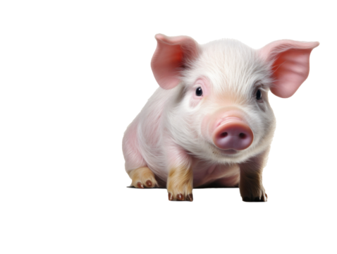 Close-up portrait of a curious young pig with pink ears and snout on transparent background