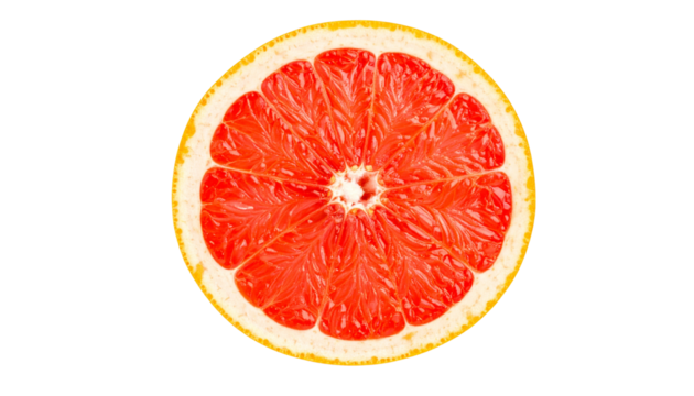 Grapefruit half showing vibrant pink pulp, isolated on transparent background