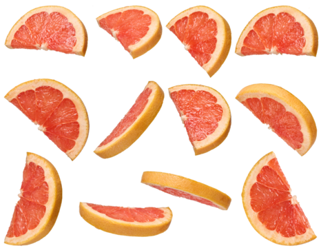 Round grapefruit halves with juicy pulp and zest in different angles on an isolated background