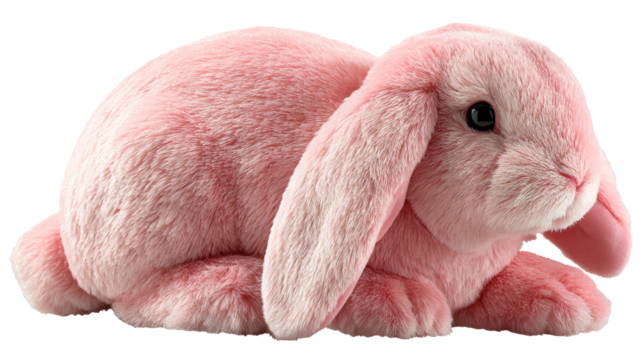 A fluffy white rabbit with pink ears sitting upright against a black background in a studio shot on transparent background
