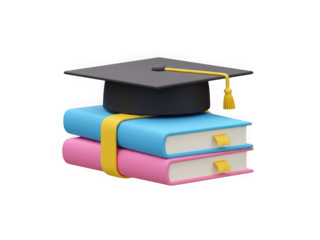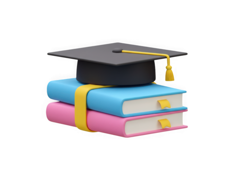 Graduation cap topper on stack of blue and pink books with yellow ribbon bookmark