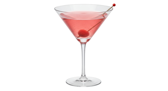 Refreshing pink beverage in a clear glass filled with ice and bubbles. transparent background