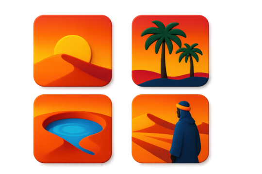 Desert Sunrise Icons. 3D icon set of sunrise and sunset in desert: rising sun over dune, pink sky behind palms, glowing oasis