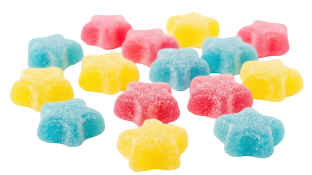 Colorful star-shaped gummy candies PNG isolated on transparent background, sweet chewy confectionery for kids and party favors