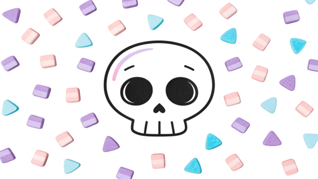 Whimsical skull patterns with pastel elements on transparent background