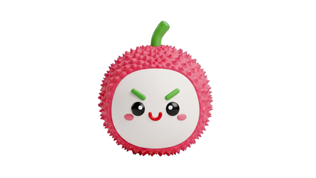 Adorable pink raspberry with a cute smiley face and leaves, isolated on a black background