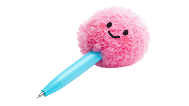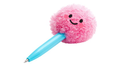 Cute pink fluffy pen with a smiling face, perfect for school and fun writing moments
