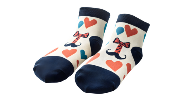 High-res image of a pair of fun novelty socks featuring ties and mustache patterns, neatly folded