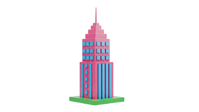 Pink and blue toy skyscraper on green base