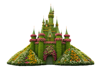 Fantasy castle covered in lush green moss and colorful pink flowers, isolated on a transparent background