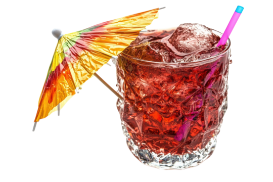 Refreshing red cocktail with ice a colorful umbrella and a pink straw on a black background on transparent background