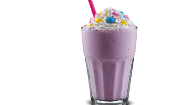 Pink tumbler banner ad. 3D Illustration of a gradient tumbler bottle loaded with strawberry shake displayed on podium, with berries, ice cubes and stainless straw around