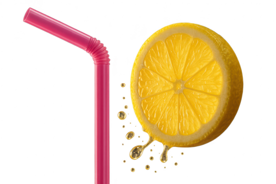 Refreshing lemon slice and pink straw isolated on transparent background, citrus