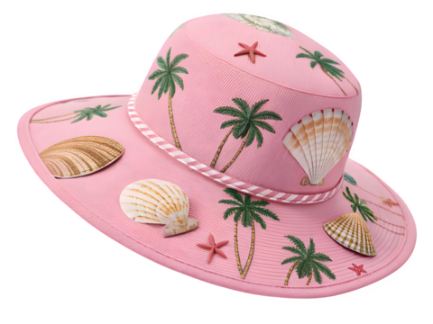 Elegant straw sun hat with a vibrant pink ribbon isolated on transparent background.