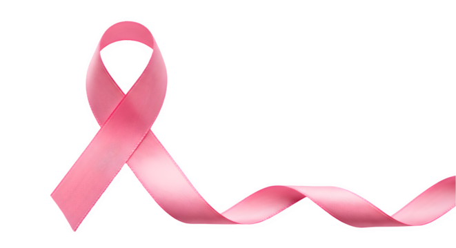 Woman wearing bright pink with breast cancer awareness ribbon, transparent background