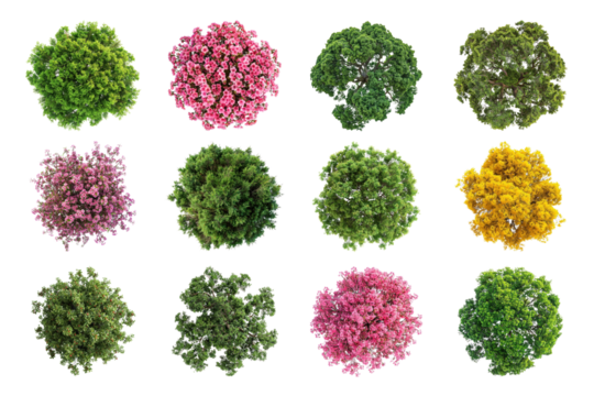 Set of flowering trees in full bloom, realistic 3D, isolated on white background