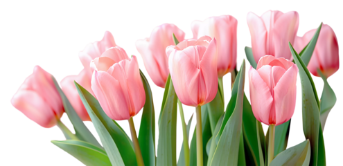 Vibrant pink tulips bloom with green leaves against a white background, cut out transparent
