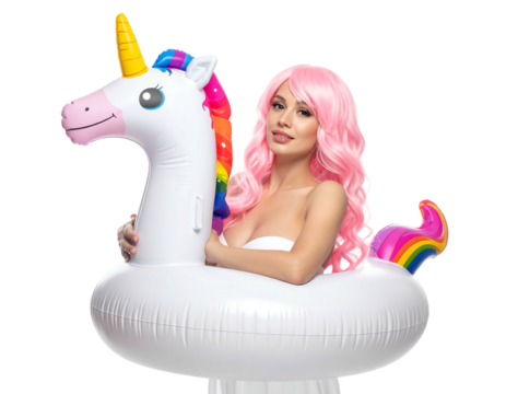 Woman with pink curly wig, white fabric wrap, holds inflatable unicorn float, bright studio lighting, black background