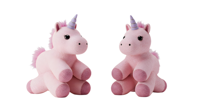 Pink unicorn plush toy with golden horn on transparent background