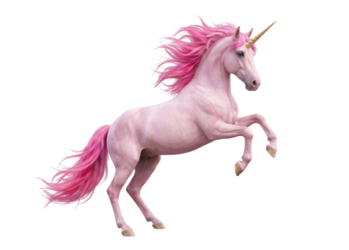 Pink unicorn rearing on hind legs isolated on white background
