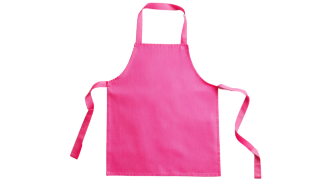 Two aprons with flower pockets hanging on wooden hangers isolated on transparent background