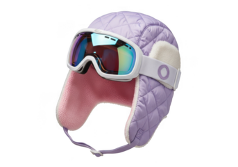 Purple quilted trapper hat with pink lining and white ski goggles, isolated on transparent background