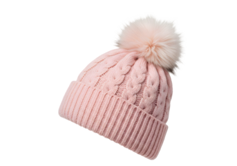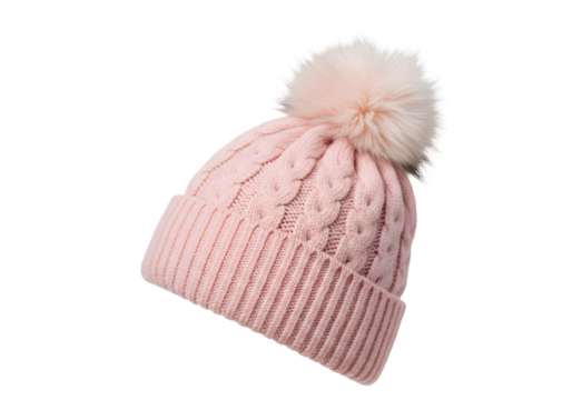 Closeup of a knitted pink beanie hat, isolated on transparent background