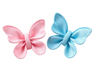 A simple white background featuring two colorful bows in shades of blue and pink