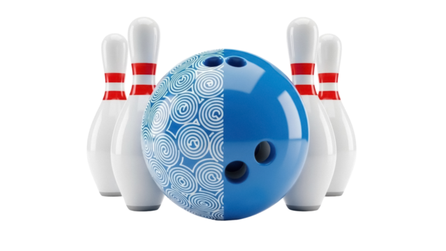 Blue bowling ball with spiral pattern and pins isolated PNG, sport equipment for bowling alley and recreational activity