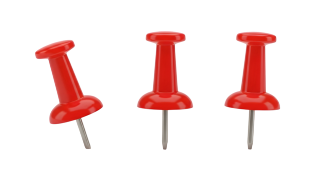 Three bright red push pins with metallic tips in a row isolated on a transparent background office supplies