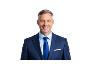 Smiling businessman in pinstripe suit on transparent background